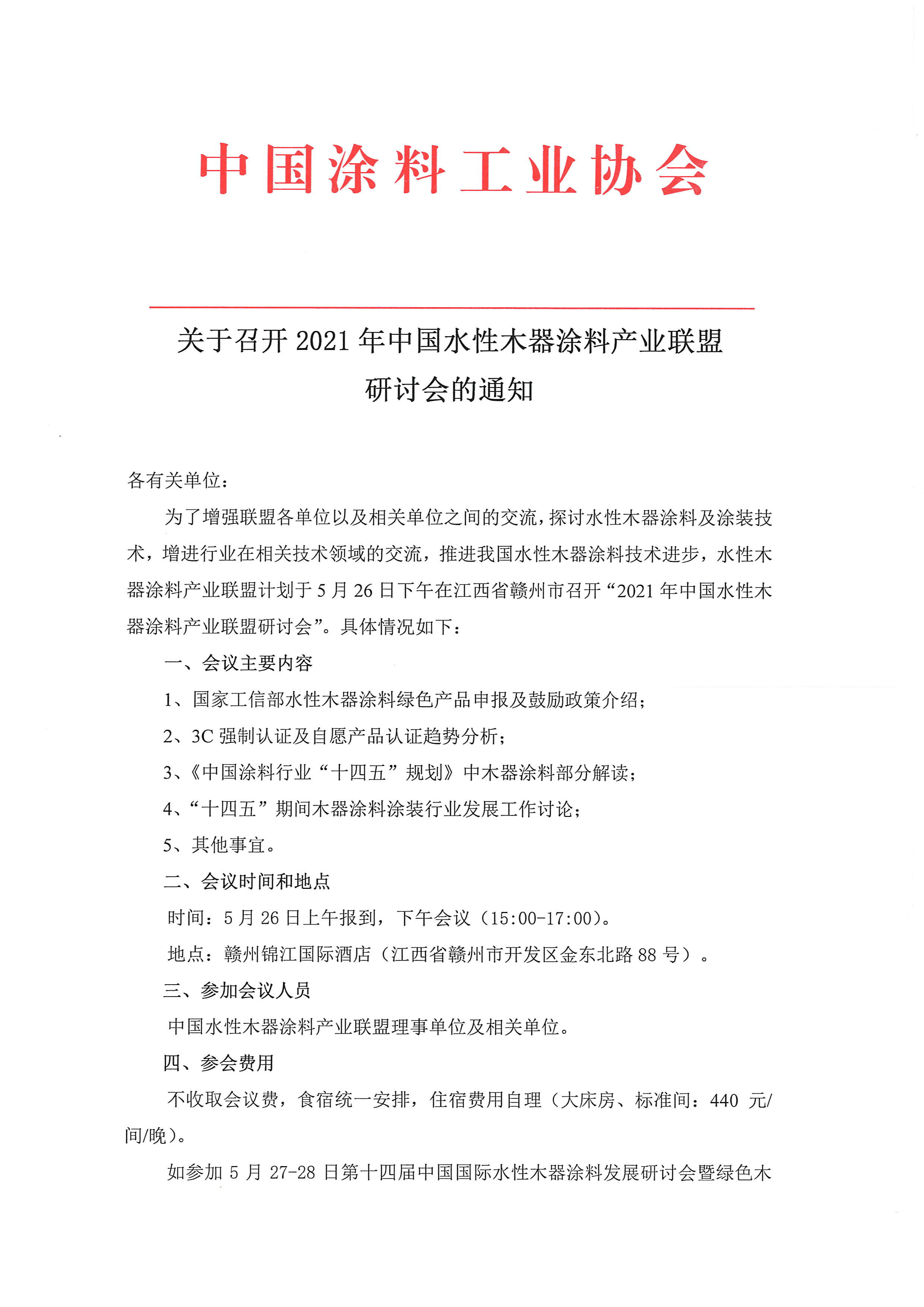 为了增强联盟各单位以及相关单位之间的交流,探讨水性木器涂料及涂装技术,增进行业在相关技术领域的交流,推进我国水性木器涂料技术进步,水性木器涂料产业联盟计划于5月26日下午在江西省赣州市召开“2021年中国水性木器涂料产业联盟研讨会”。